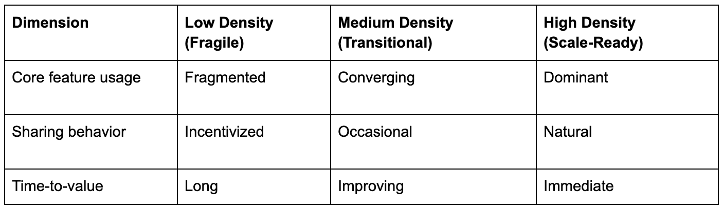 This row tells you how much imagination your product requires. Long time-to-value means users must configure, design, or understand before benefiting. This kills density. Improving means onboarding and defaults are doing some work. Immediate means success is obvious in the first session.