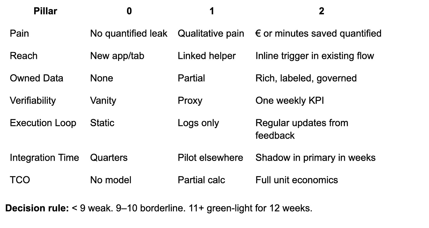 Each project gets a score from 0–2 on every dimension. If something lands below a 9, it’s weak. Anything 11 or higher is worth testing in an 8–12 week sprint with clear metrics.