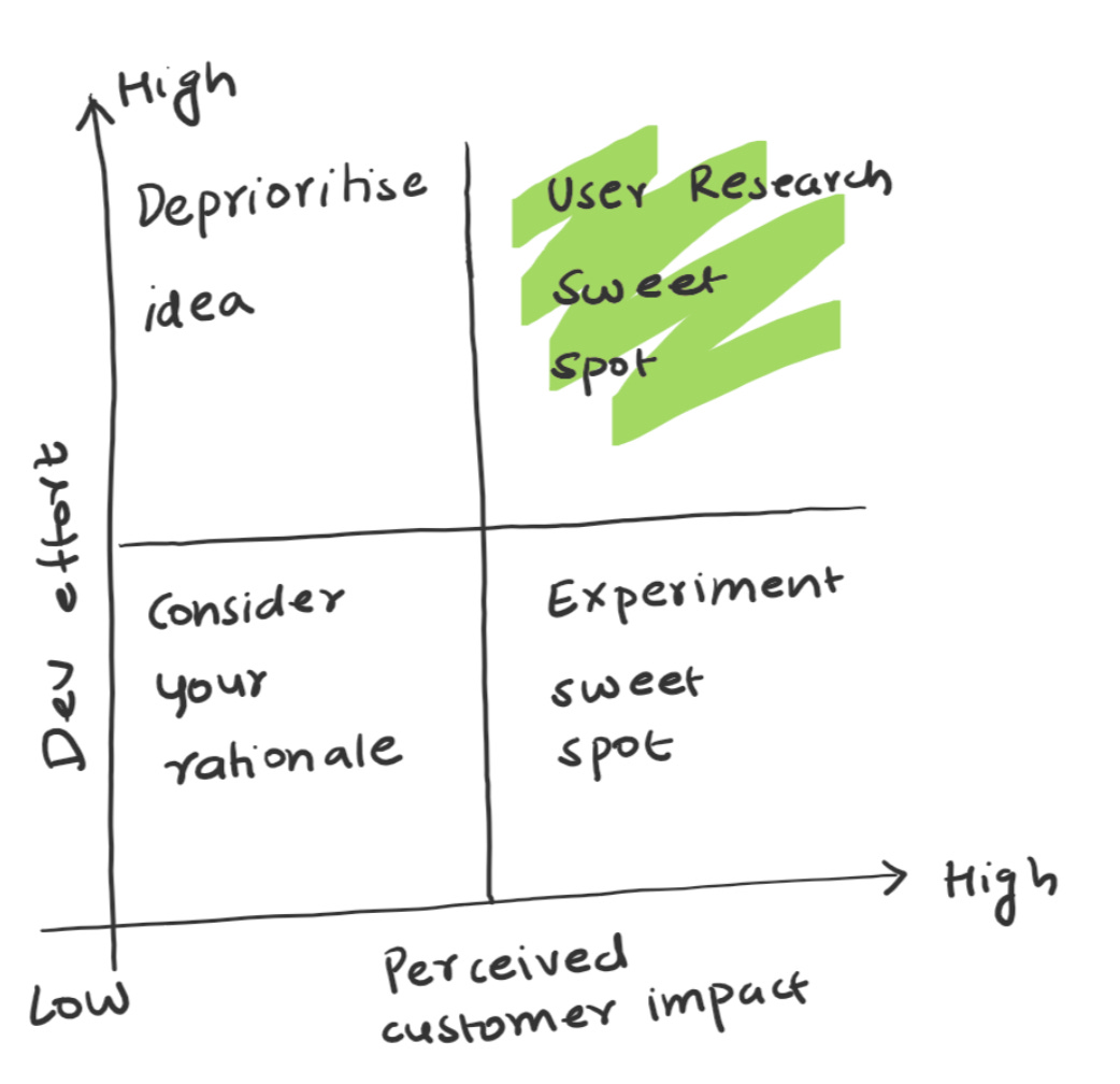Projects with high development times and high perceived user impact benefit most out of user research, as they bring more confidence to the problem being solved and allow for testing the solution before building. If I’m building something that has high perceived customer impact but low development effort, I consider ‘build->test->ship as an experiment’ instead of research. The cost incurred to put the feature out there is low, and I can see customer benefits through an A/B test.