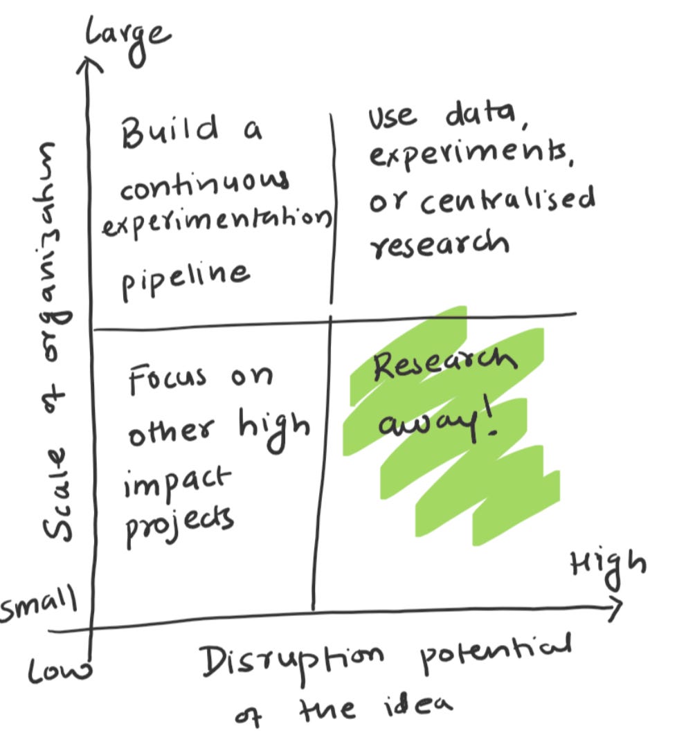 Larger organisation looking to optimise their established product with small, incremental steps benefit from investing in continuous experimentation pipelines and maintaining data sanity - this allows to try multiple ideas rapidly and establish lines for success. Larger organisations working on disruptive ideas should research, but even before going to this step, try to find signals for success with existing data, past experiments, and signals picked up from centralised user research.