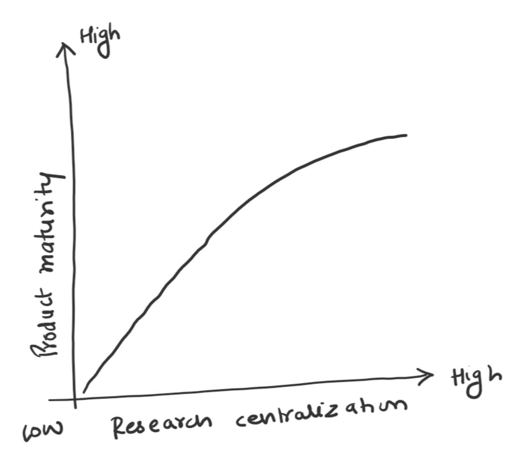As organisations scale, it becomes impossible to research every idea that is to be implemented. Most large organisations centralise their user research into teams that work on large ideas, with satellite teams or projects spawning as and when necessary.